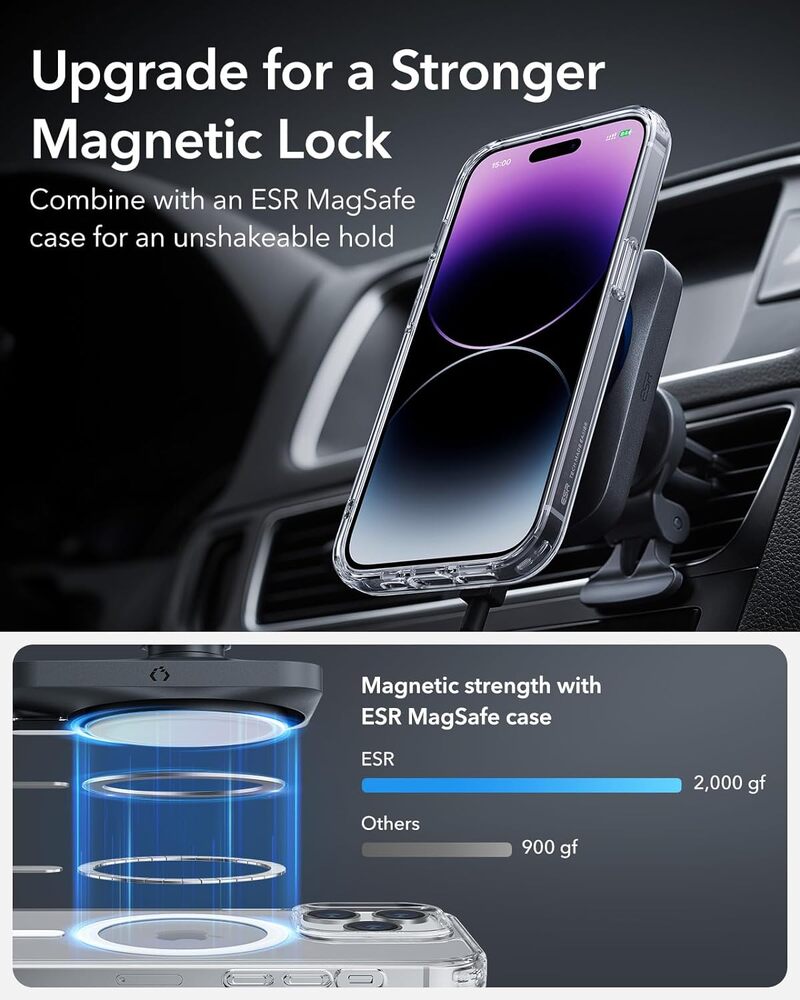 - Secure Magnetic Lock: Built-in magnets lock onto ESR MagSafe cases with 2,000 g of holding force to keep your phone powerfully secure over even the bumpiest roads.