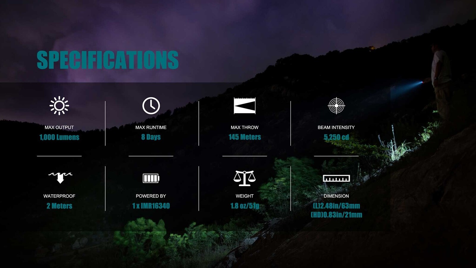 | Power Source: 1 x 550mAh IMR 16340 (Included) |