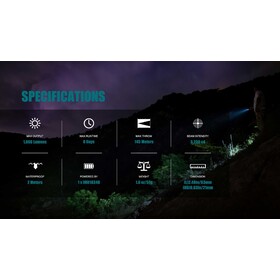 | Brightness Outputs: Turbo - 1000 Lumens > 300 Lumens - 90 Seconds > 37 Minutes - Please note it is normal for small torches to get quite warm when outputting high lumens. High - 600 Lumens > 300 Lumens - 90 Seconds > 45 Minutes Medium - 60 Lumens - 3 Hours 40 Minutes Low - 12 Lumens - 20 Hours Moonlight - 0.5 Lumens - 8 Days |