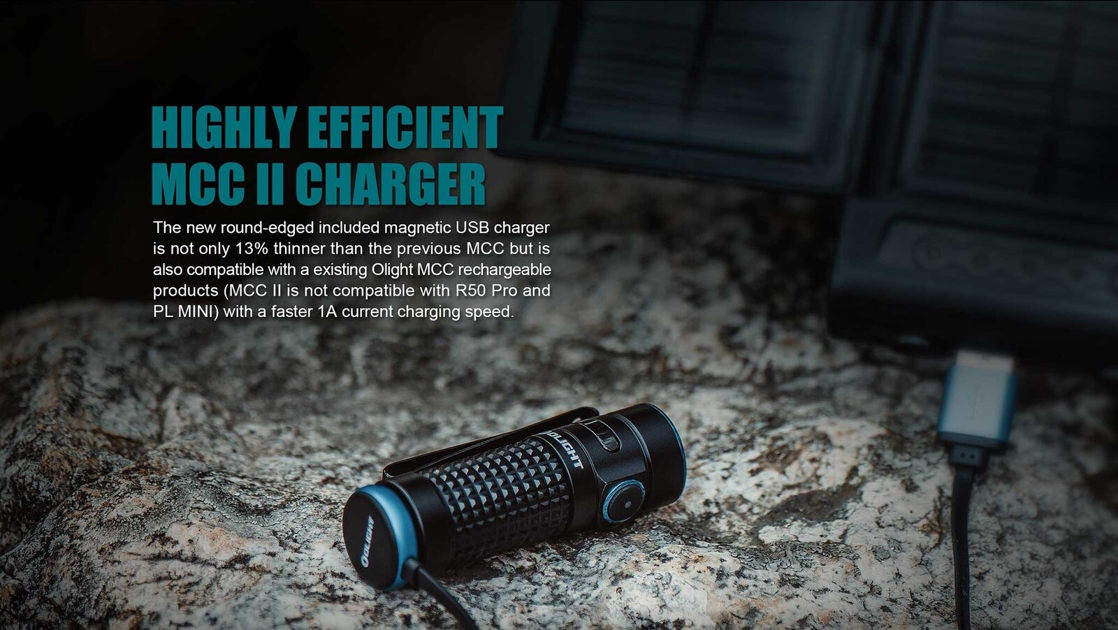- Light can be charged internally (when equipped with included battery) using MCC charging cable to base