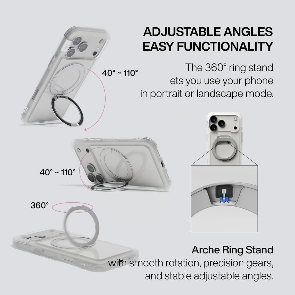 - Adjustable Ring + Stand Function — 360° rotating ring enables effortless angle tuning for streaming, video calls, reading, or selfies. Doubles as a stable stand and a confident finger grip for easier one-hand handling on the go.