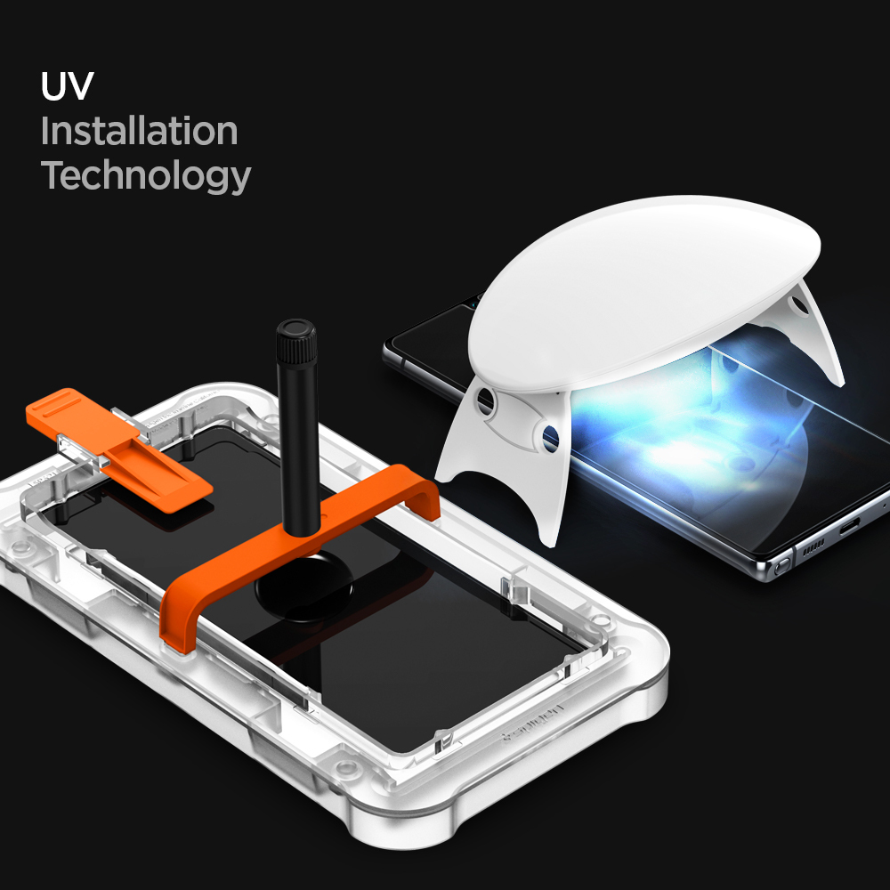 - Note: Please DO NOT touch or try to move the glass after the UV glue starts spreading until after the first curing process. Please remember to register your fingerprint twice after applying the screen protector for the best fingerprint sensor performance.