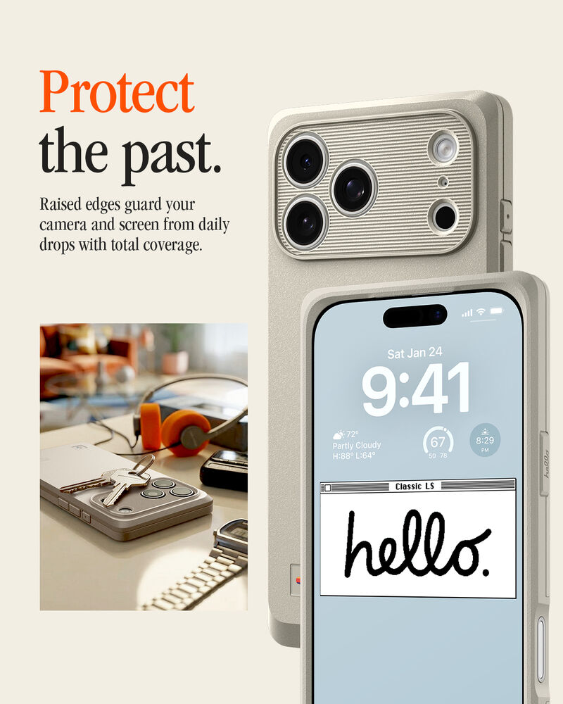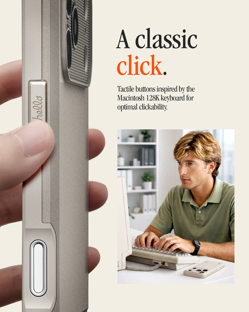 - Side buttons styled after vintage keyboard keys, with "Hello" engraved on the power button.