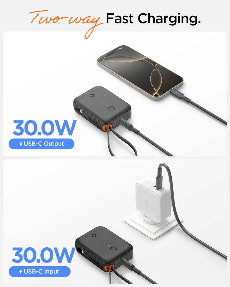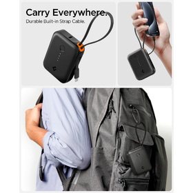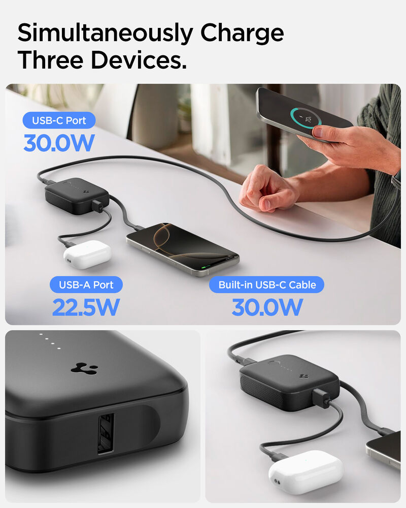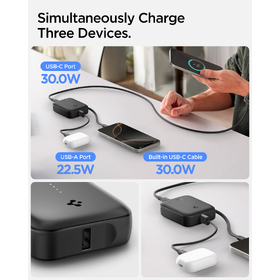 - With a built-in 30W USB-C cable, you’ll never need to carry extra cords. In addition, the power bank offers a Output: USB-C 1&2 30W, USB-A 22.5W, allowing you to charge up to three devices simultaneously.