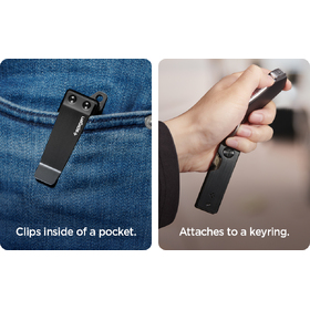 - Clips onto pocket or attaches to any carabiner keyring with cutout.